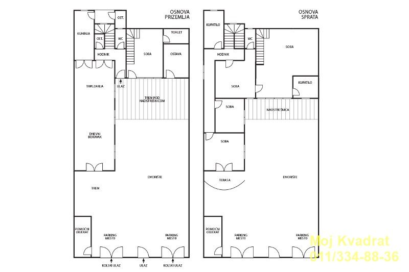 Prizemlje: dnevni boravak sa trpezarijom, kuhinja, spavaća soba, tri ostave, dva toaleta i hodnik.