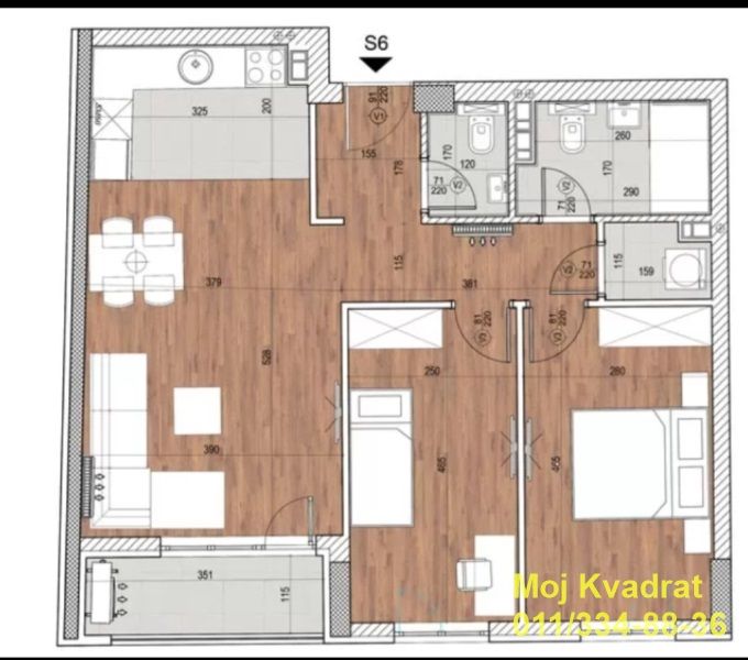 Stan se sastoji iz predsoblja, dnevnog boravka sa kuhinjom i trpezarijom, dve spavaće sobe, kupatila, toaleta, tehničke sobe i lođe.