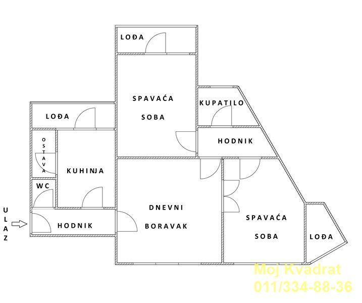 Stan se sastoji od ulaznog hodnika, kuhinje sa trpezarijom i ostavom, dnevnog boravka, dve spavaće sobe, toaleta, kupatila i tri lođe.