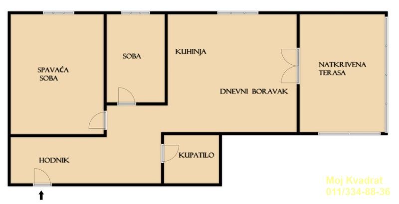 Sastoji se od komotnog dnevnog boravka sa trpezarijom i kuhinjom, dve sobe, velike natkrivene terase (pod terase obložen pločicama i prekriven vodootpornim itisonom), kupatila i hodnika. Stan se prodaje kompletno namešten kao na slikama.