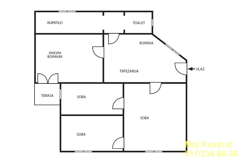 Prostorije: ulazni deo, kuhinja sa trpezarijom, dnevna soba, tri spavaće sobe, kupatilo i terasa.